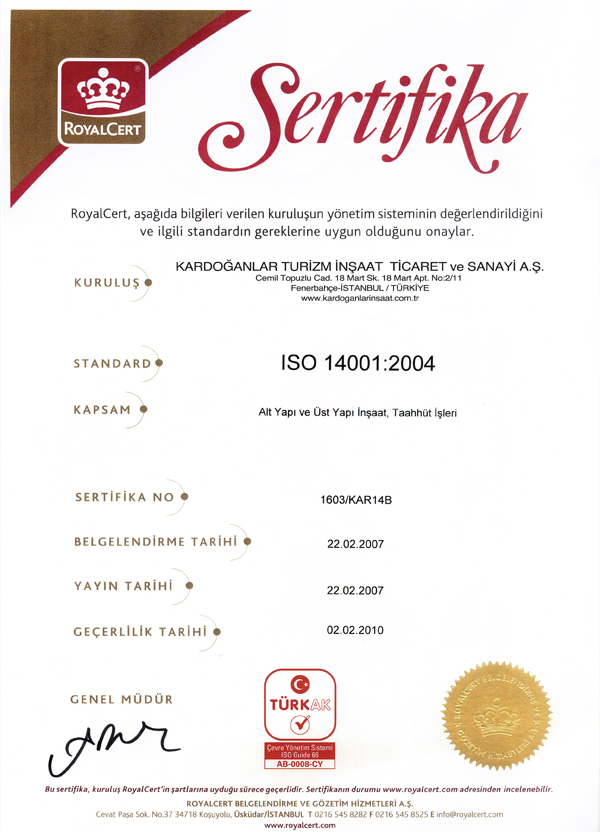 Kardoğanlar İnşaat imzasını taşıyan bütün projeler kaliteyle çevre ve iş sağlığı alanında gözettiği yüksek standartlara uygun olarak gerçekleştirilmektedir. Kardoğanlar İnşaat ISO 9001 2000 kalite yönetim sistemi, OSHAS 18001 2007 güvenlik yönetim sistemi, ISO 14001 2004 çevre yönetim sistemi sertifikalarınıda alarak bu standartlarını belgelemiştir